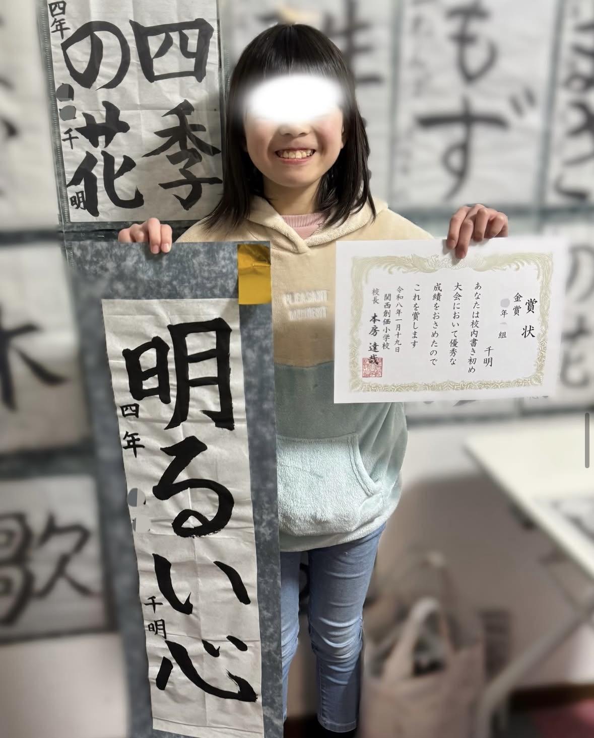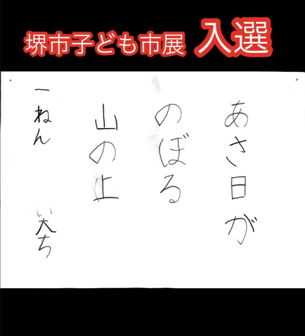 【堺っ子書道展】堺市長賞 1名受賞 堺市議会議長賞 1名受賞 特選 10名受賞 【堺市こども市展】入選10名 【堺市立中学校連合書初展】入賞3名 【明るい選挙啓発書道コンクール】 堺市明るい選挙推進協議会会長賞 1名 入選1名 【関西創価小学校書き初め展】金賞1名 【69回 全国書きぞめ作品展覧会】日本書道芸術連盟協議会賞1名 【明治神宮72回全国少年新春書道展】入選1名 |